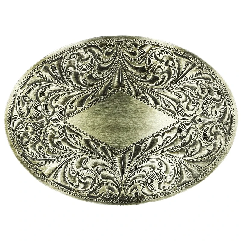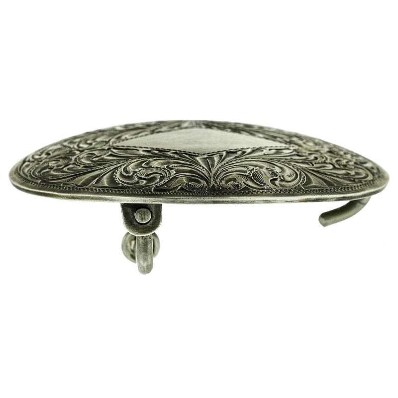- Sterling silver oval buckle engraved with classic Western scrolling