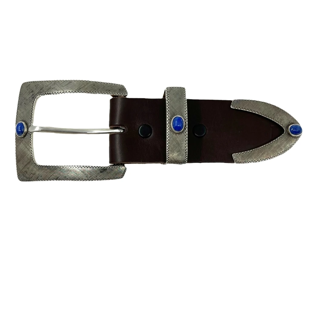 Three piece sterling silver buckle set with a crosshatch finish with lapis stones set in on each piece. Fits on a 1.5 inch belt strap; sold separately here. Handmade in New Mexico.