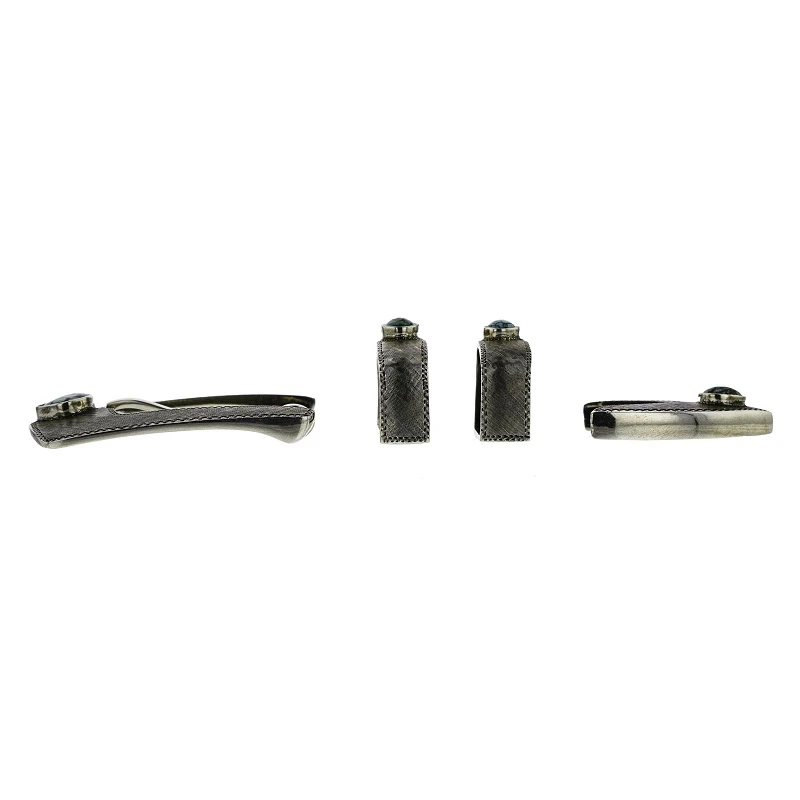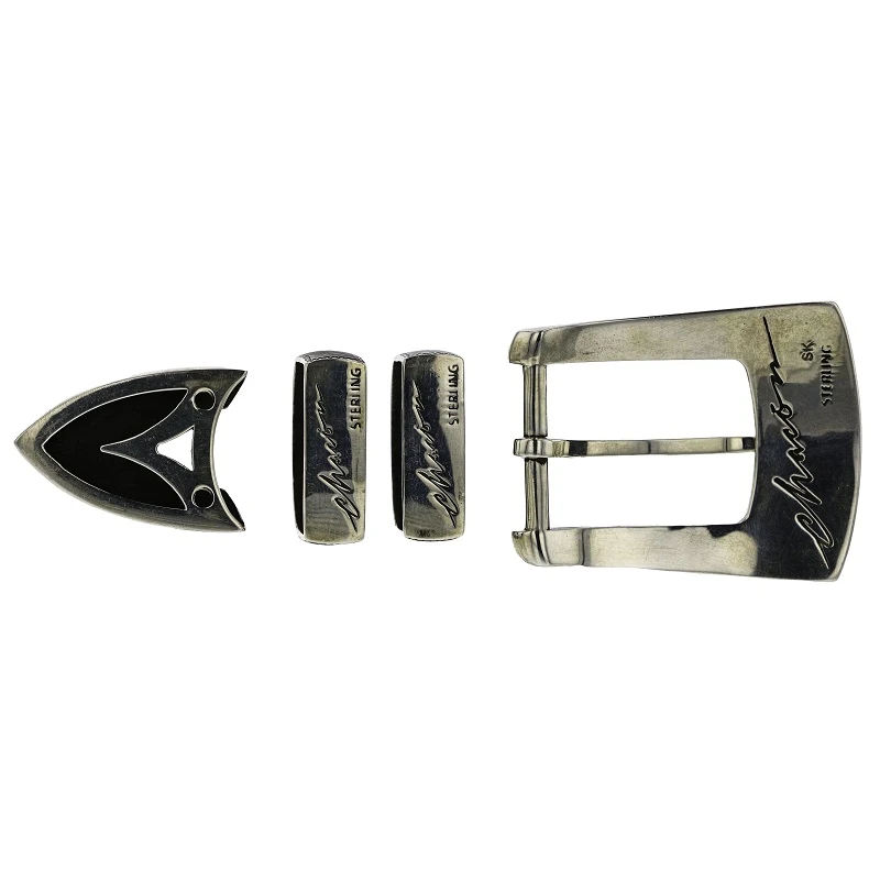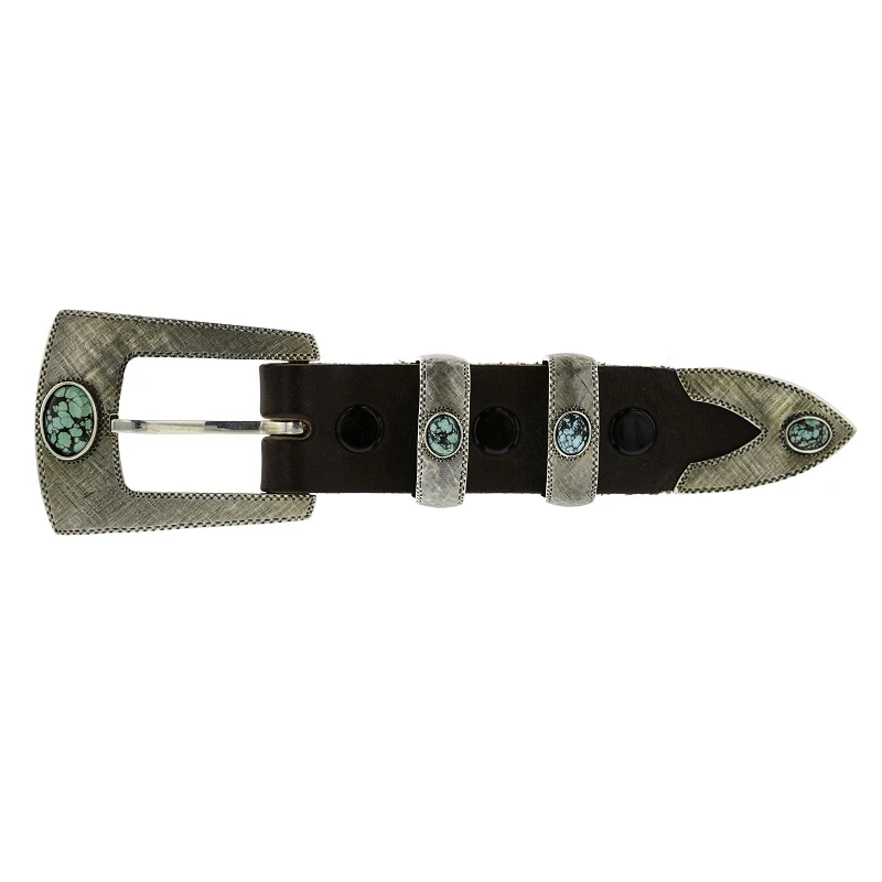 Four piece sterling silver buckle set with a crosshatch finish and turquoise stones set on each piece. Fits on a 1 inch belt strap; sold separately here. Handmade in New Mexico.