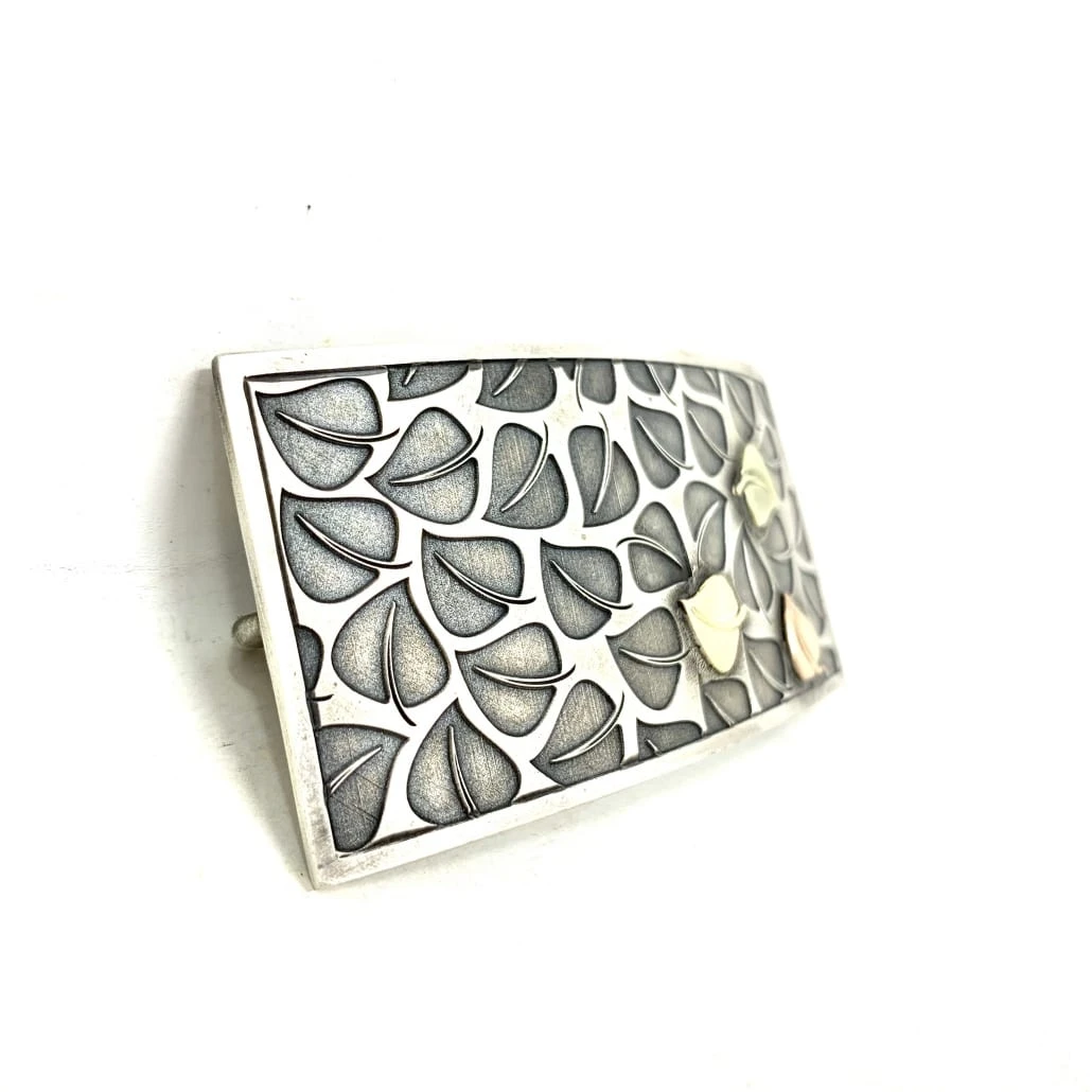 Sterling silver Aspen leaf buckle with 14k rose, yellow and green gold leaves. Fits on a 1 inch belt strap; sold separately. Kemo Sabe logo on the back. This buckle is part of our first in-house made Kemo Sabe Grit buckle collection! Handmade at our Hat Ranch in Texas.