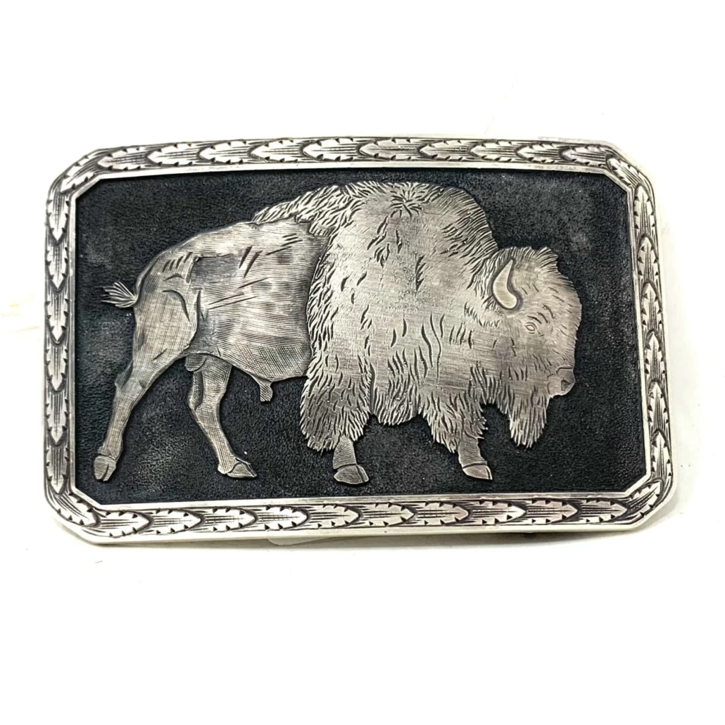 Heavy gauge sterling silver with hand-engraved bison and hand-engraved wheat leaf border. Fits on a 1.5 inch belt strap; sold separately. Kemo Sabe logo on the back. This buckle is part of our first in-house made Kemo Sabe Grit buckle collection! Handmade at our Hat Ranch in Texas.