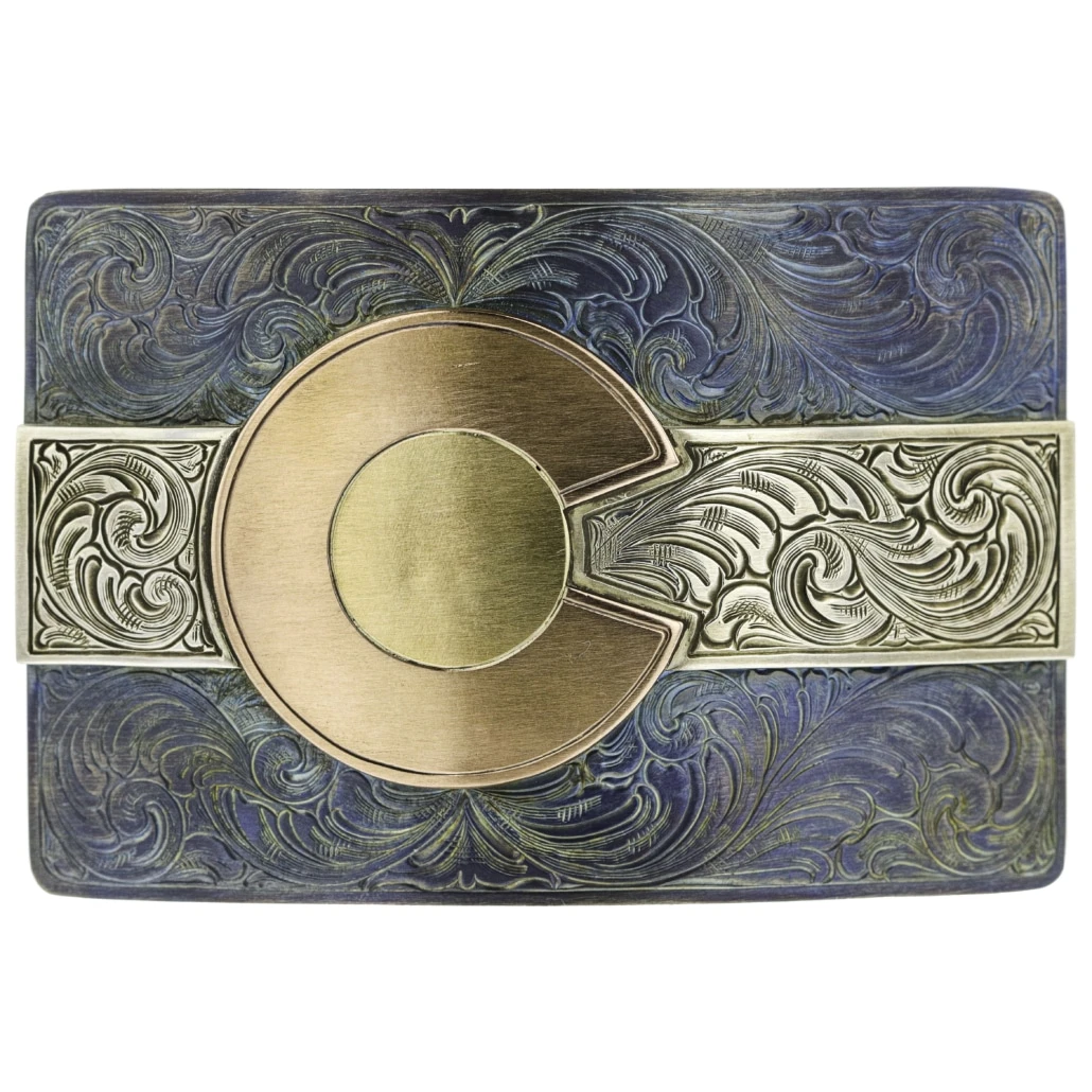 Handmade in our Hat Ranch in Texas with our talented engravers. Sterling silver, 14k yellow and rose gold and heat blued and red titanium, Colorado flag overlaid. Wester scrolling detail. Custom engraving on the back as well. Fits on a 1.5″ belt strap, sold separately.