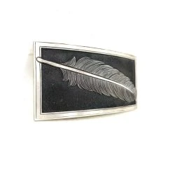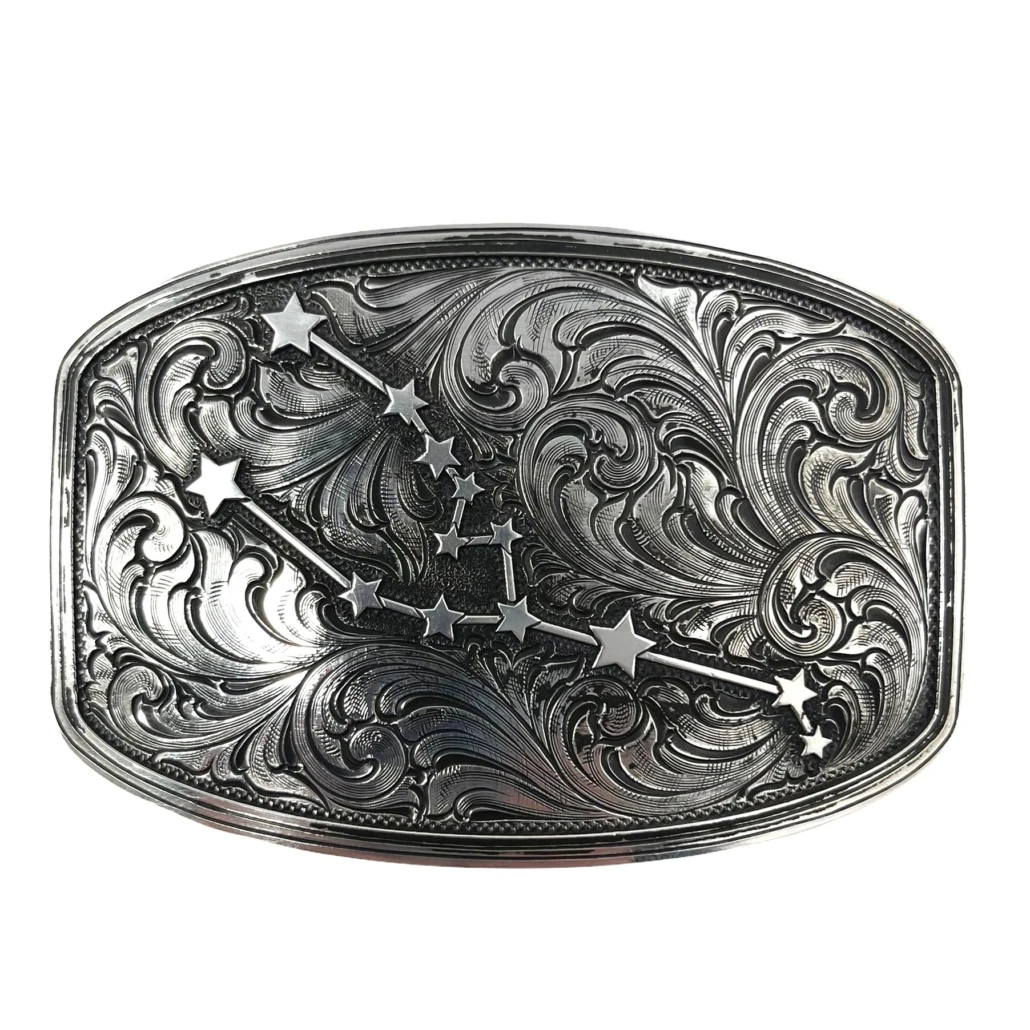 Handmade in our Hat Ranch in Texas with our talented engravers. Sterling silver. Constellation design overlaid. Custom engraving on the back as well. Fits on a 1.5″ belt strap, sold separately.