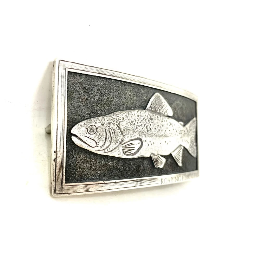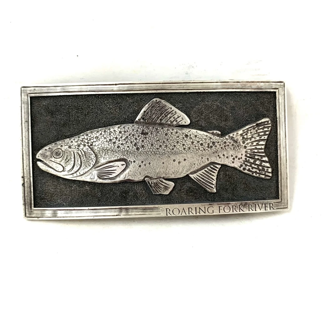 Sterling hand-engraved Roaring Fork trout buckle with hand-engraved fly on the back. Hand-stippled and dark patina finish. Fits on a 1 inch belt strap; sold separately. This buckle is part of our first in-house made Kemo Sabe Grit buckle collection! Handmade at our Hat Ranch in Texas.