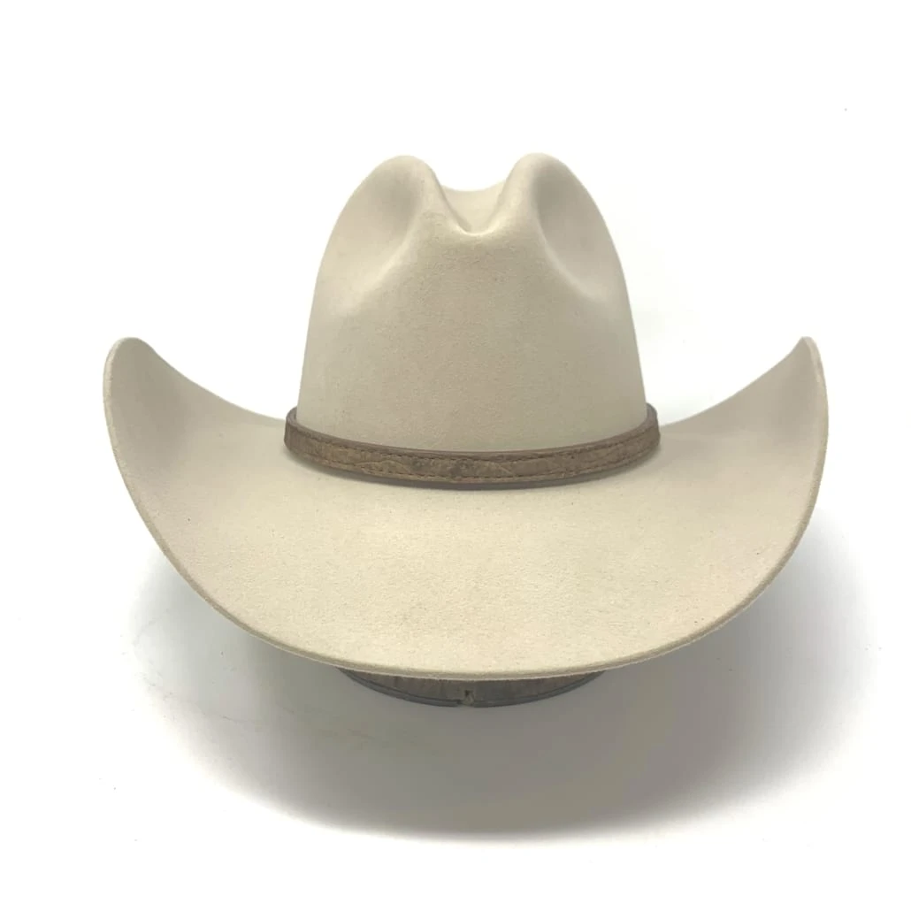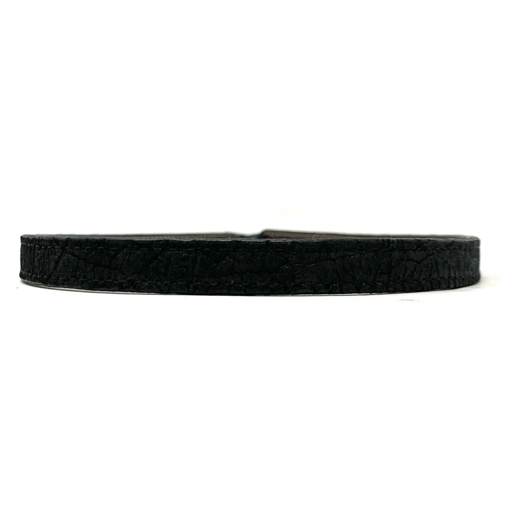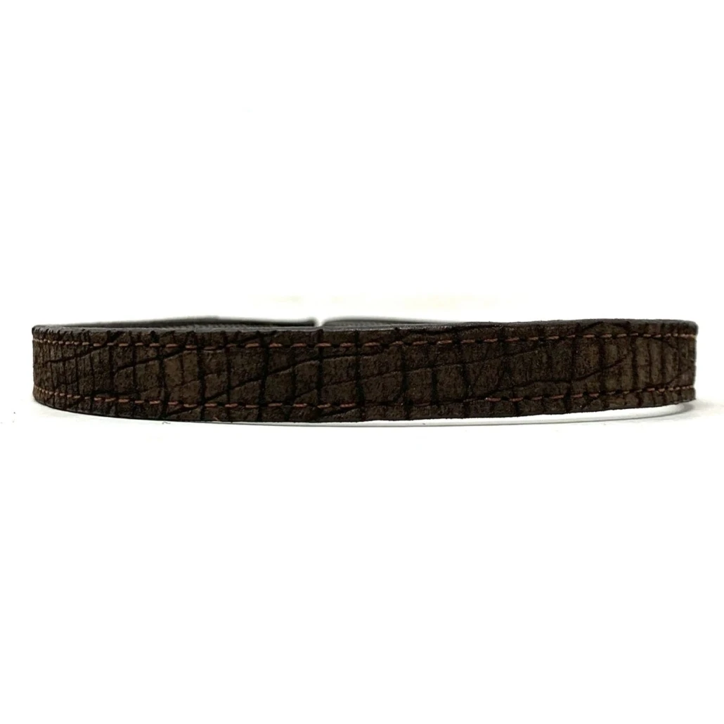 This hat band is made out of hippo skin. Each skin is unique; appearance, color and pattern will vary a bit. Simple leather tie in the back to fit any size hat.
