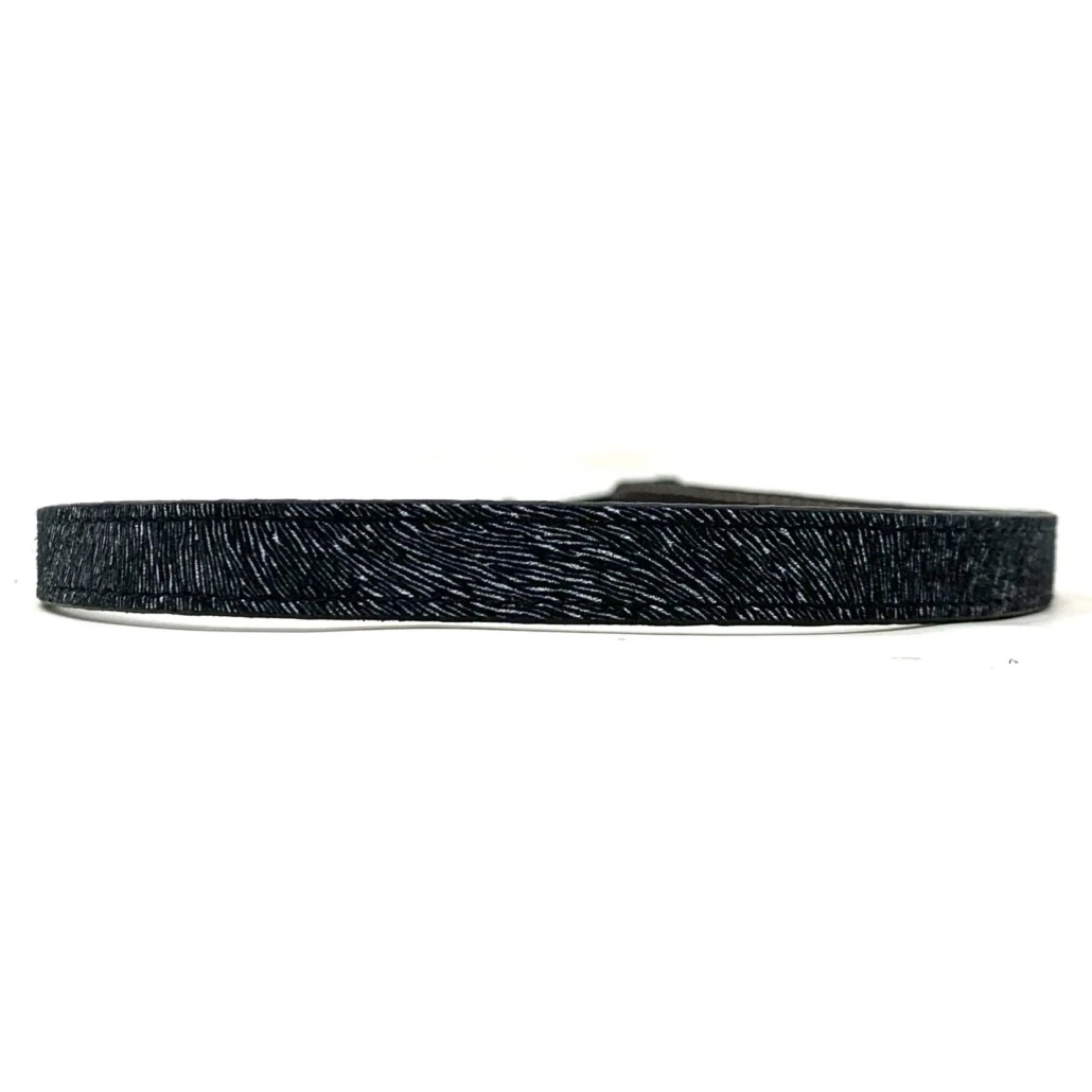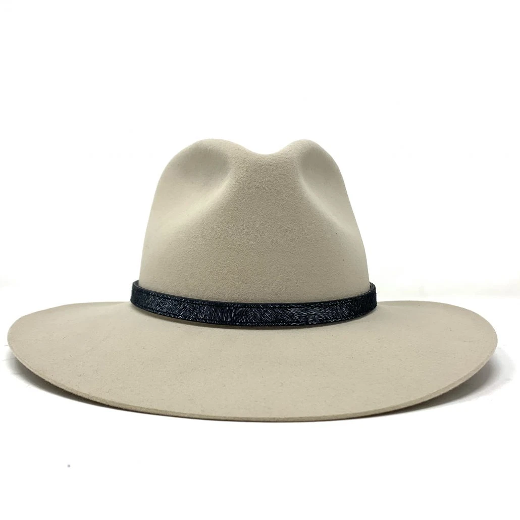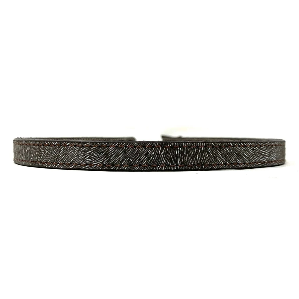 This hat band is made out of javelina skin. Each skin is unique; appearance, color and pattern will vary a bit. This hat band will fit on any of our hats. There is a small leather tie for closure in the back. Thin hat bands (pictured here) measure 1/2 an inch wide.