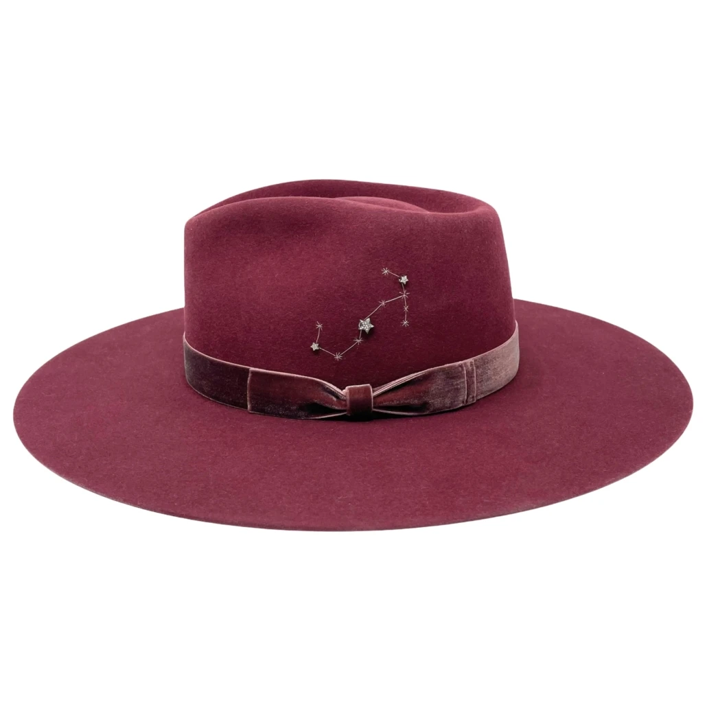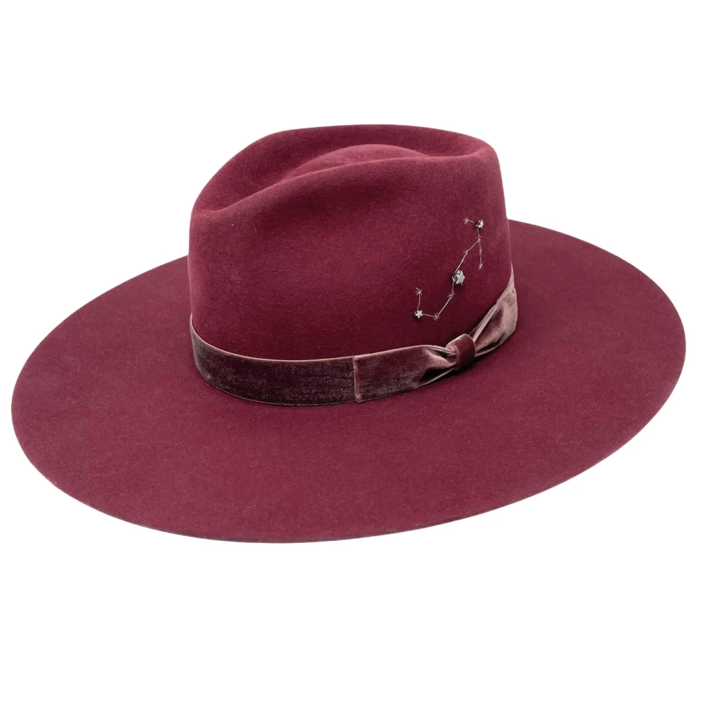 The Constellation Collection is here! This handmade Hat is constructed of a blend of beaver and rabbit fur felt and features a Cavalry crown, interior comfort sweatband, and a distressed velvet hat band. With a hand stitched constellation and diamond beads sewn in, these hats are truly one-of-a-kind. This hat has a 4″ brim and is handmade in the USA. You can choose any of these 12 color hats to make any of the constellations in. These hats will take three weeks to make, so please consider that when ordering. Give us a call with questions if you need any help.